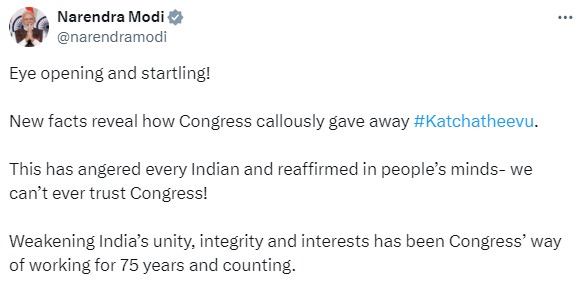 In his social media post, PM Modi stated that 'Eye-opening and shocking revelations! New facts demonstrate how ruthlessly Congress handed over Katchatheevu to Sri Lanka. This has infuriated every Indian and implanted the notion that Congress can never be trusted! The method of Congress has always been to weaken India's unity, integrity, and interests.'