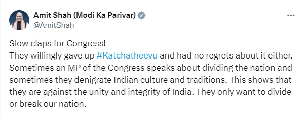 Home Minister Amit Shah also partook in the condemnation through his social media post, declaring 'Slow applause for Congress! They themselves relinquished the island without remorse. Whether it's a Congressman talking about dividing the country or maligning Indian culture and traditions, it shows that they are against India's unity and integrity. They seek only to divide or break our nation.'