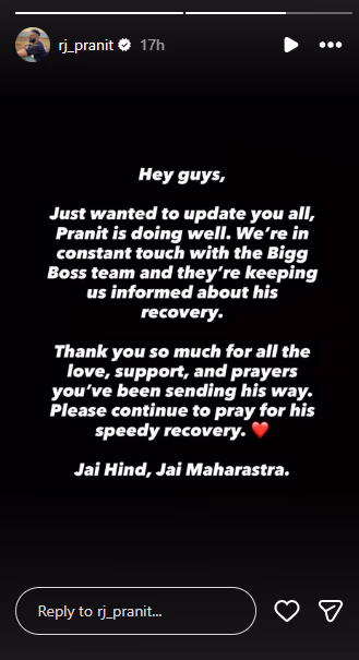 From Pranit's account, a story was posted saying, 'Friends, we want to inform you that Pranit is perfectly fine. We are in continuous contact with the Bigg Boss team, and they are updating us on his recovery. Thank you all for your love, support, and prayers. Please keep praying for his speedy recovery. Jai Hind, Jai Maharashtra.'