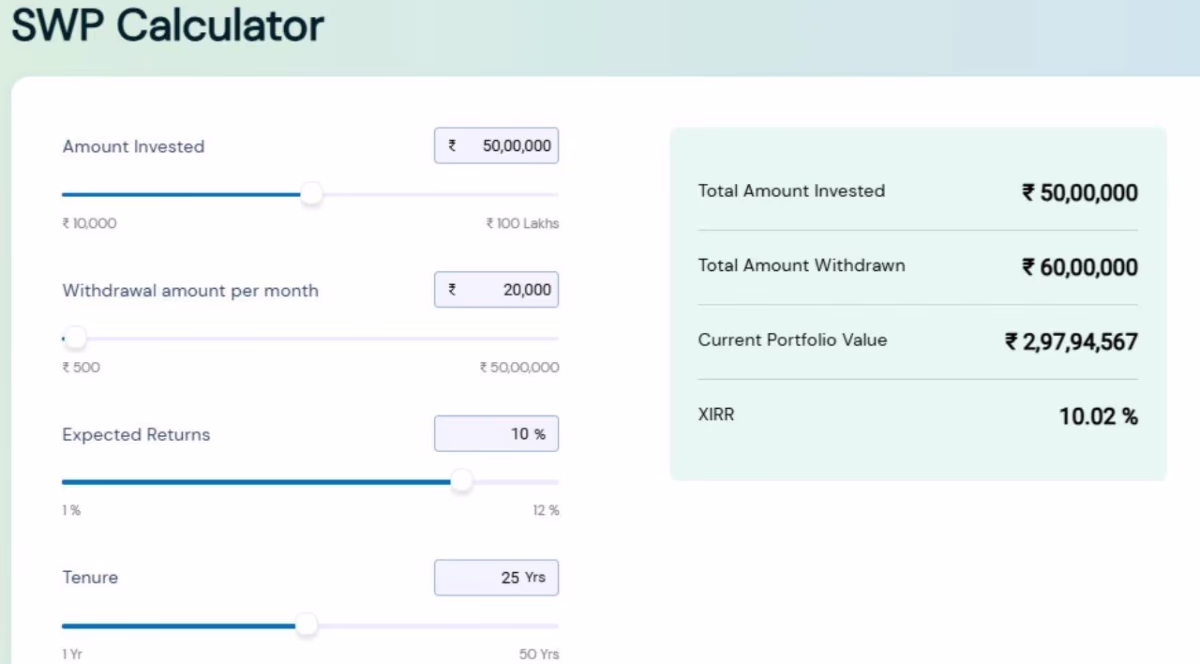Suppose you've accumulated a corpus of 50 lakh rupees through SIP or the stock market and want to halt further investments, yet still draw monthly withdrawals without depleting your funds. SWP serves this purpose best. Using the SWP Calculator, we gauged how much investment is needed and how much you’ll receive.