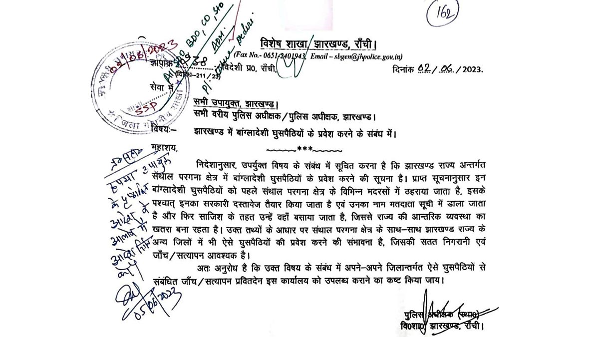 Connecting dots to another letter dispatched last year by Jharkhand's Special Branch, its subject reads - Concerning the entry of Bangladeshi infiltrators into Jharkhand. Sent across several departments, it claims infiltrators use border-area madrasas as base camps, weaving their future plans while crafting essential documents.