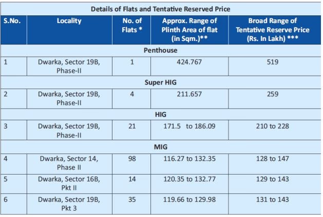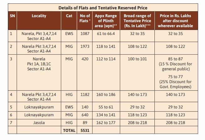 Flat Type: HIG, MIG, and EWSLocation: Jasola, Lok Nayak Puram, and NarelaPrice: Starting from Rs 29 lakhsNumber of Flats: 5,531Allocation Method: 'First Come, First Serve'