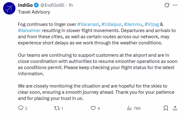 Furthermore, Indigo reported, "Dense fog blankets cities like Varanasi, Udaipur, Jammu, Visakhapatnam, and Jaisalmer, slowing down flight operations. Weather-related delays may occur on flights to and from these locations, as well as on some routes across our network.