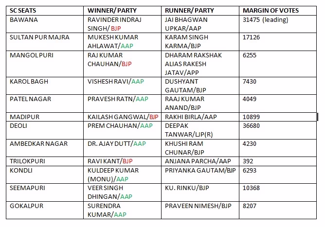 Four SC-dominated constituencies in Delhi were also won by BJP, namely Bawana, Mangolpuri, Madipur, and Trilokpuri. In Bawana, AAP's Jai Bhagwan Upkar faced defeat against BJP's Ravinder Indraj Singh by roughly 31,000 votes.
