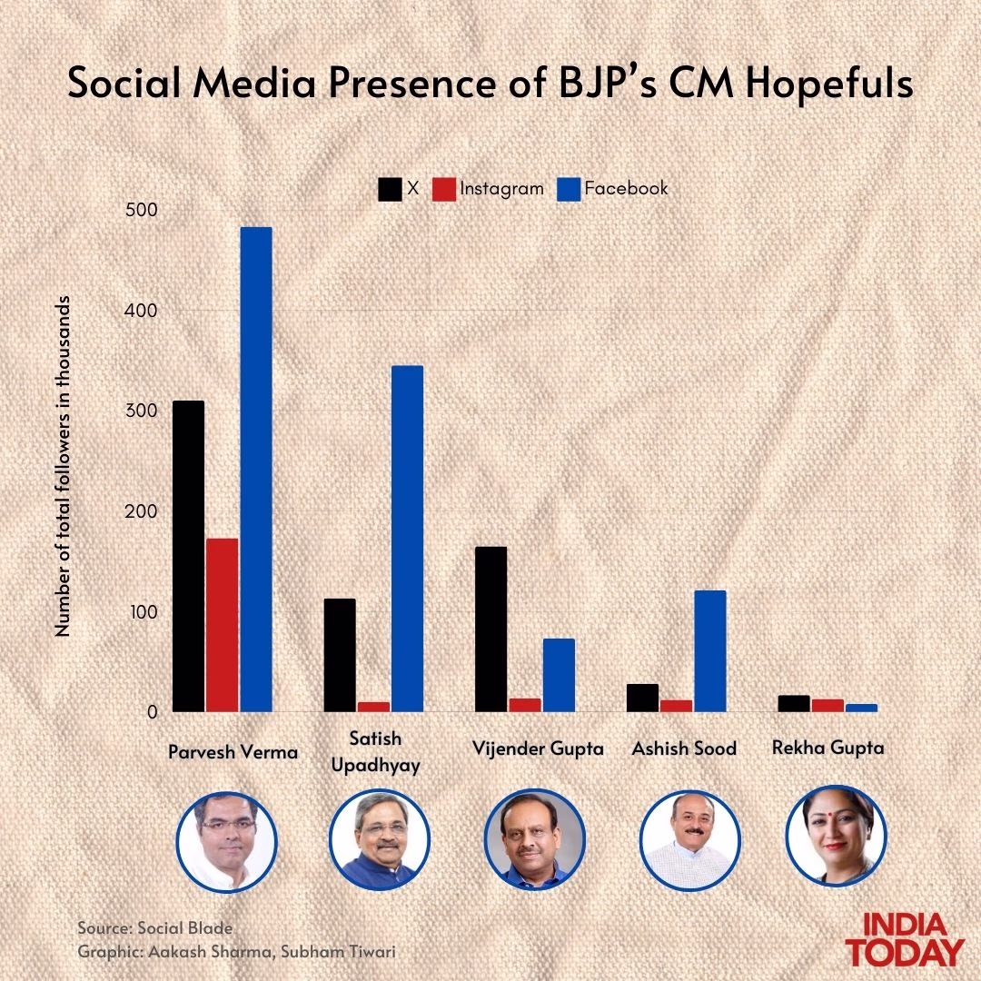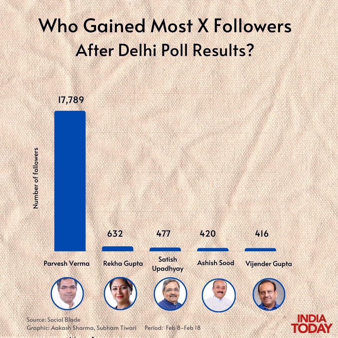 Meanwhile, former Leader of Opposition Vijender Gupta gained 416 followers on X, whereas Satish Upadhyay added 477 followers on the platform. During our analysis, BJP leader Ashish Sood attracted 420 followers on X and 1,054 on Instagram. Jitender Mahajan's numbers remain unavailable due to his limited social media presence.