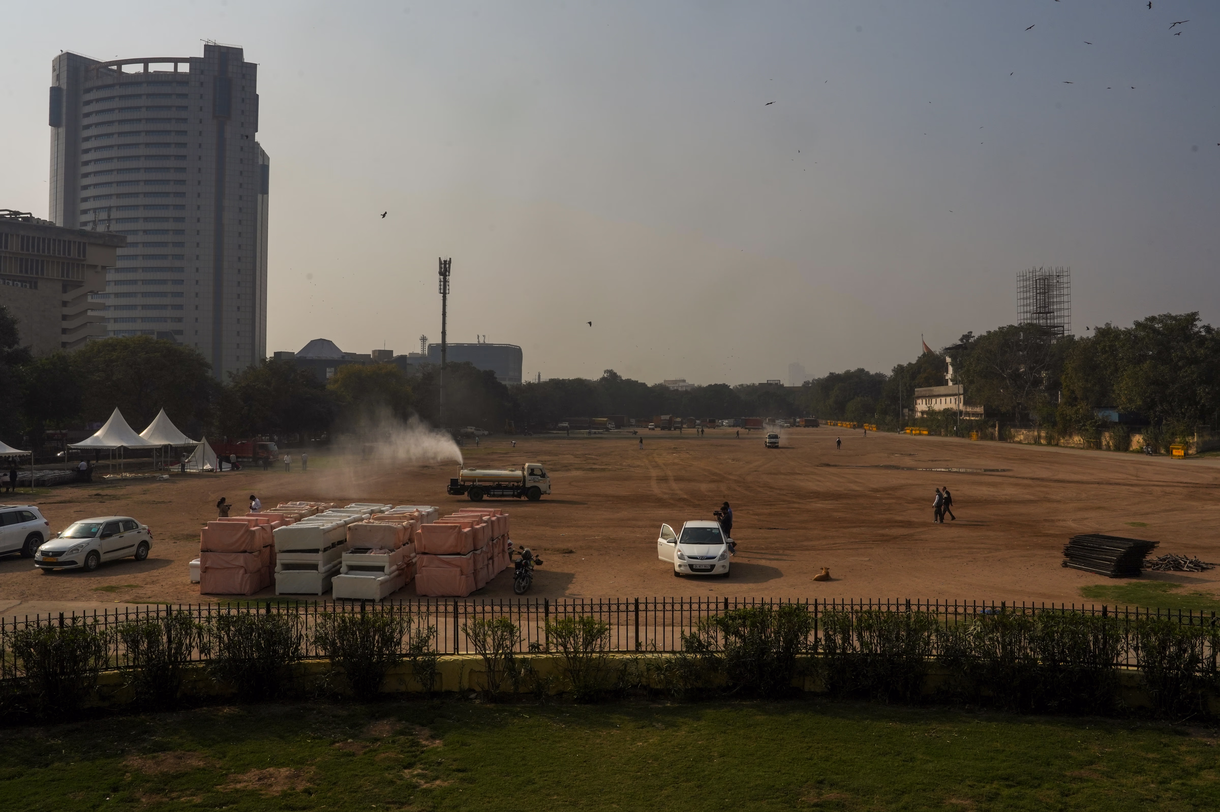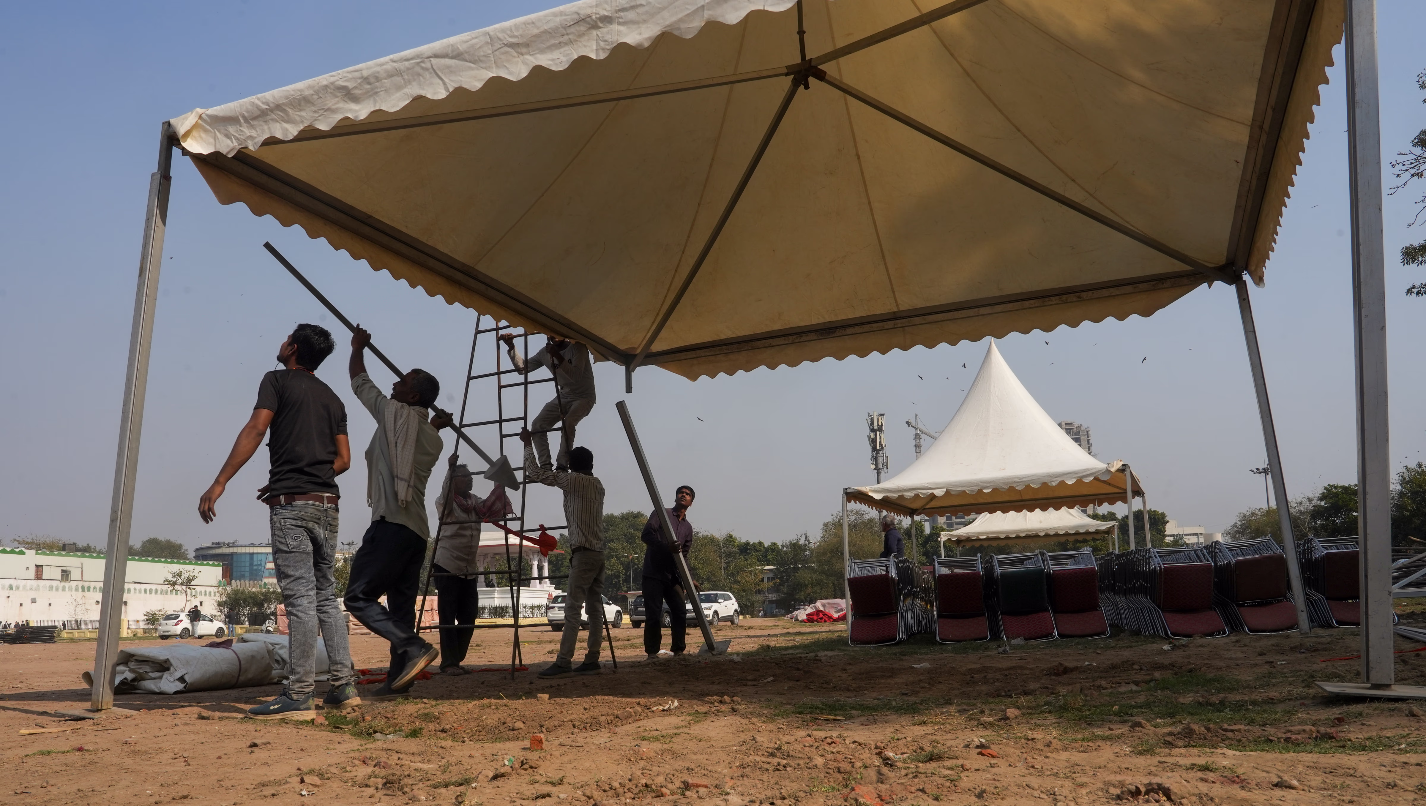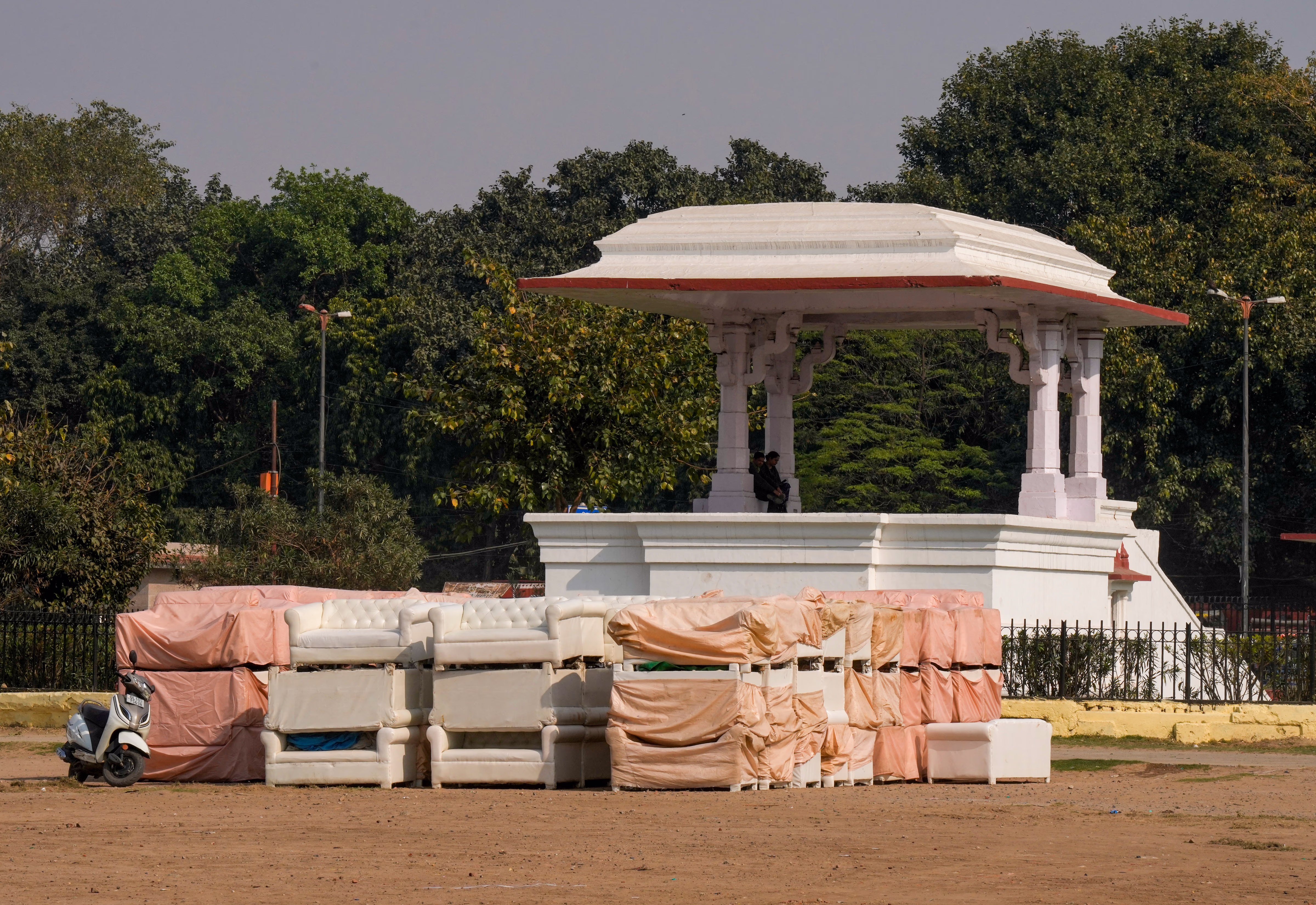 Preparations for the swearing-in ceremony continue at Ramlila Maidan ahead of the CM announcement. Scheduled for February 20 at 4:30 PM, the ceremony will feature three stages. One large stage measuring 40×24 and two others sized 34×40. Approximately 100 to 150 chairs will be set on the stages, while about 30,000 chairs will be arranged for the public.