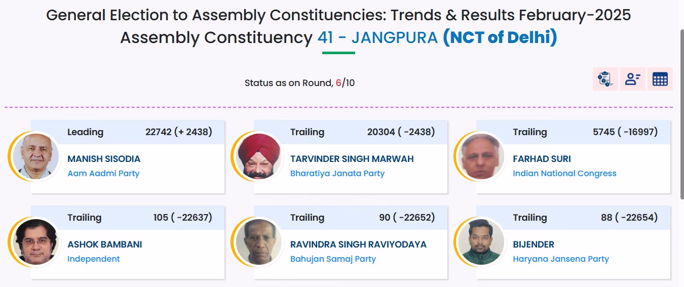 Manish Sisodia at Jangpura leads post the fifth counting round. Ramesh Bidhuri consistently holds the lead from Kalkaji after the eighth round.
