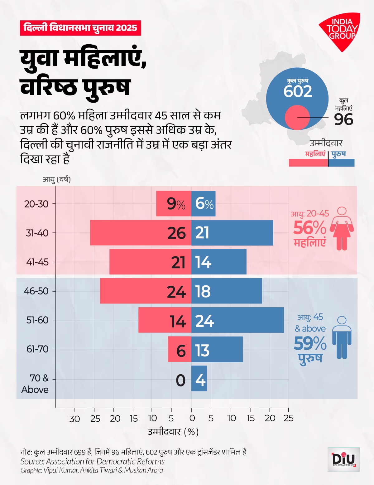 According to data from the Association for Democratic Reforms (ADR), women are entering politics at younger ages than men. Among those aged 20-30, 9% of the candidates are women, compared to only 6% of men. Similarly, in the 31-40 age group, 26% of candidates are women, with men at just 21%. Overall, 56% of female candidates are between the ages 20-45.