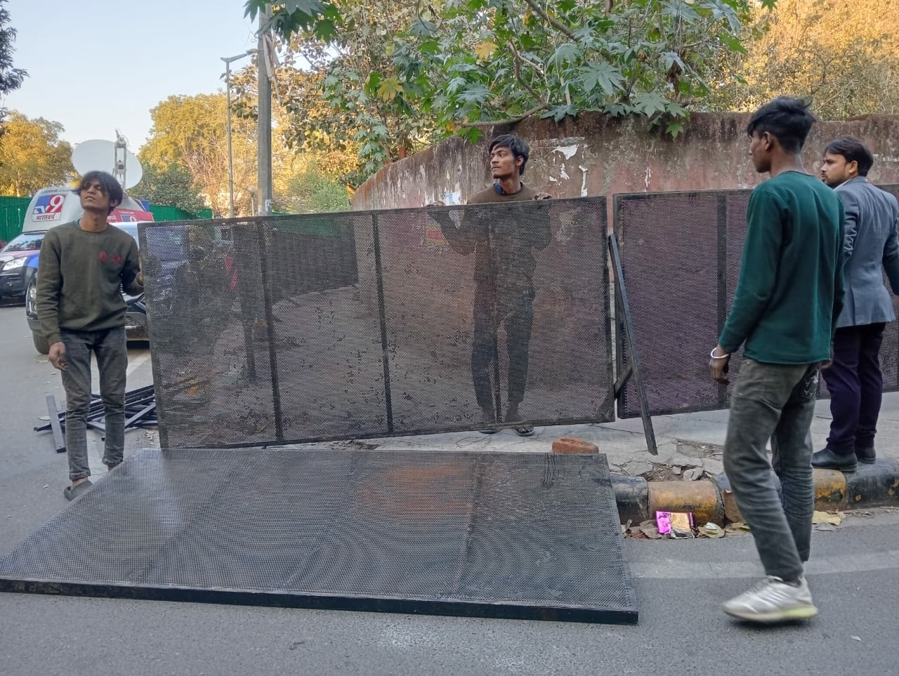 Starting with the ruling Aam Aadmi Party, preparations are in full swing ahead of the election results. A large stage has been erected outside the AAP office, with pathways being prepared for the people arriving tomorrow. Rugs are being laid down, and tables and chairs set up.