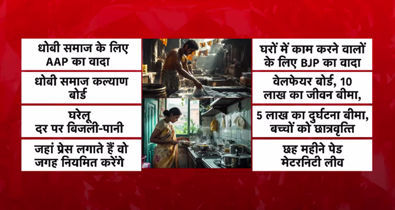 Furthermore, BJP promises direct aid of Rs 15,000 to competitive exam aspirants, with free bus rides and form fees for two attempts. Meanwhile, Kejriwal pledged to form a welfare board for the washermen community, promising residential-rate water and electricity. BJP has promised welfare boards for house helps, insurance for auto drivers, and scholarships, along with maternity benefits for women.