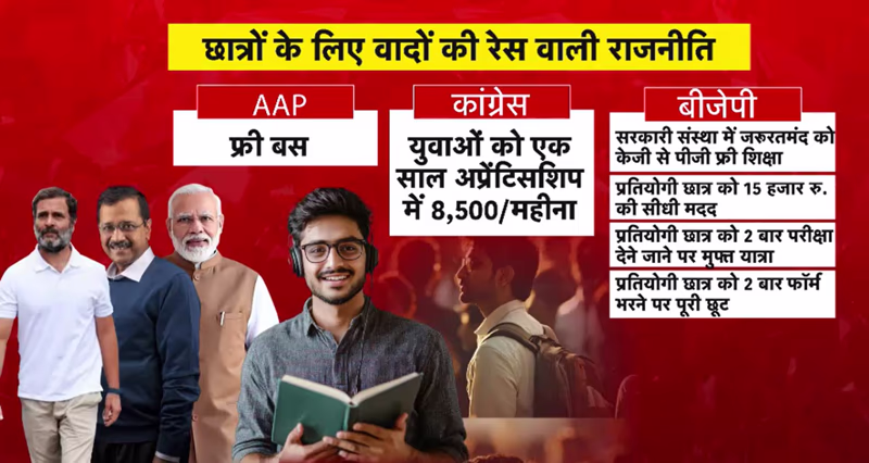 Where previously parties issued manifestos outlining their vision for development, they now make promises in installments, influenced by the scale of each other's freebie promises. Arvind Kejriwal announces new promises at daily press conferences, while BJP has unveiled its manifesto in two parts. Kejriwal promised free bus rides for students, Congress pledged an Rs 8,500 monthly apprenticeship stipend for unemployed youth, and BJP committed to free education from KG to PG for needy students in governmental institutions.