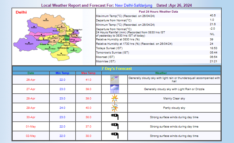 On Friday, Delhi braved a scorching 41 degrees Celsius. Evening showers, however, brought a slight respite from the intense heat. The meteorological department predicts possibilities of light rain on April 27. Following this, a heat surge is expected in the national capital with temperatures potentially hitting 40 degrees Celsius once again on April 29.