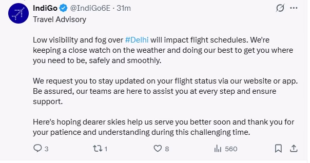 The national capital, Delhi, is engulfed in thick fog, affecting Indigo's flight schedule. The airline has issued a travel advisory, stating they are closely monitoring the weather to ensure passengers reach their destinations safely and comfortably. At 6:12 AM, the Delhi airport also issued an alert to travelers.