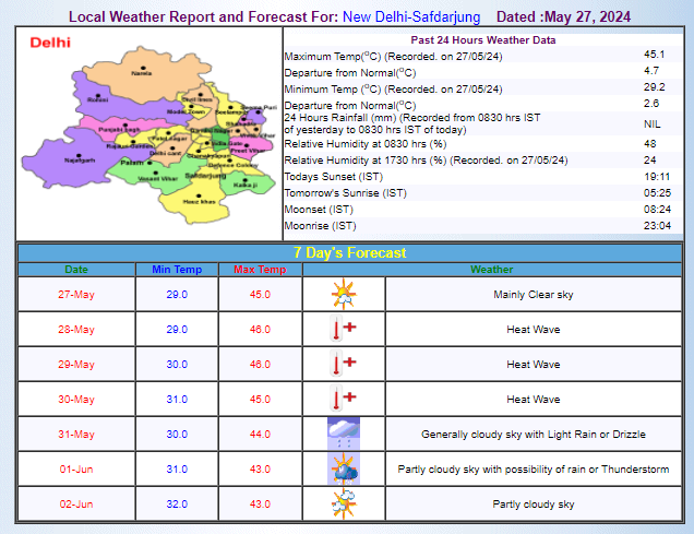 The Safdarjung Observatory, considered the official marker for the city, recorded the second-highest maximum season temperature at 45.1°C, which is 4.7 degrees above normal, while the minimum stayed at 29.2°C. Across Delhi, Sunday hit a record peak temperature of 45.4°C, marking the city's first official brush with the heatwave.