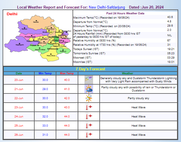 The weather in India's capital, Delhi, remains pleasant since last night. With the western disturbances kicking in, strong winds commenced from the evening of 19th June and light drizzles followed. According to the Indian Meteorological Department (IMD), dusty storms accompanied by thunderstorms and light rains are likely on 20th and 21st June. However, starting 23rd June, heatwaves are expected to make a comeback, potentially prevailing until 26th June.
