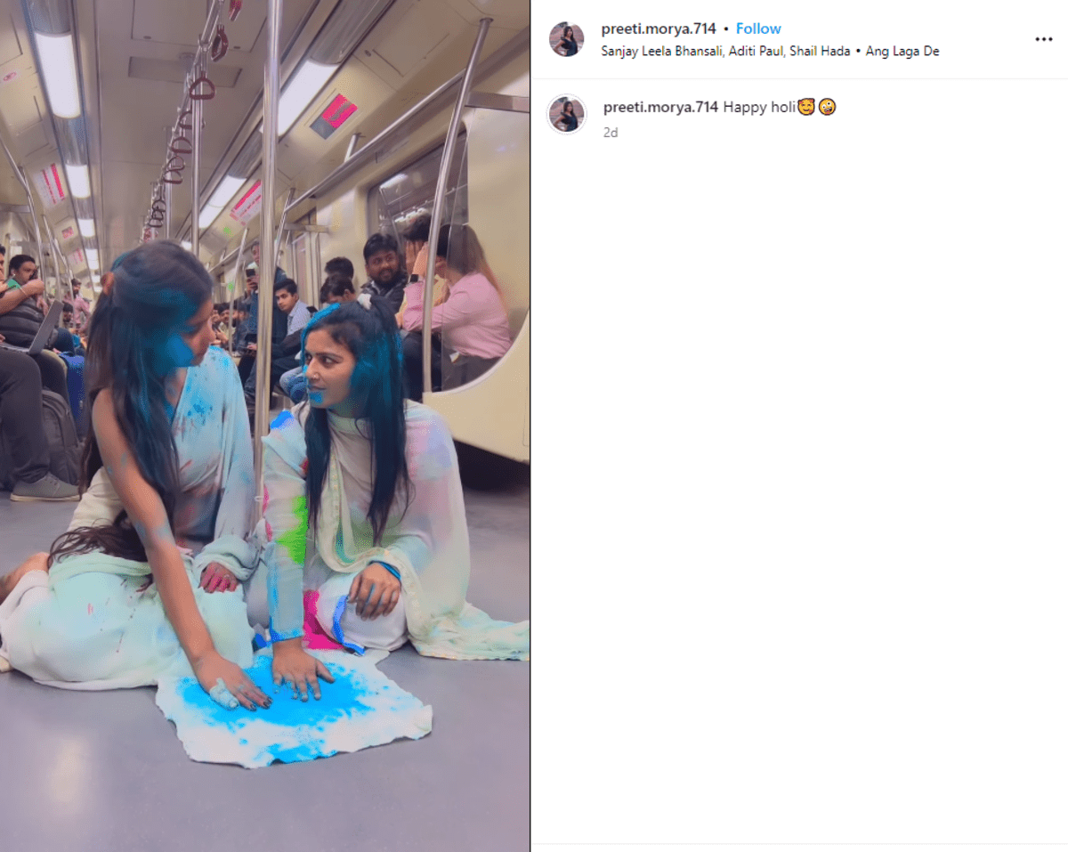Labelling it 'vulgar', 'tasteless', 'indecent' - social media users have been unleashing their judgment on the video that has gone viral featuring the 'Holi Girls' of Delhi Metro. If you have yet to see this video, let me introduce you to it. The scene unfolds in a Delhi Metro train, where two girls clad in pristine white are emulating a sequence from the film 'Goliyon Ki Raasleela Ram-Leela' to the song 'Ang Laga De.' Their entangled embrace, set against the metro floor, has triggered a flurry of accusations of indecency by many.