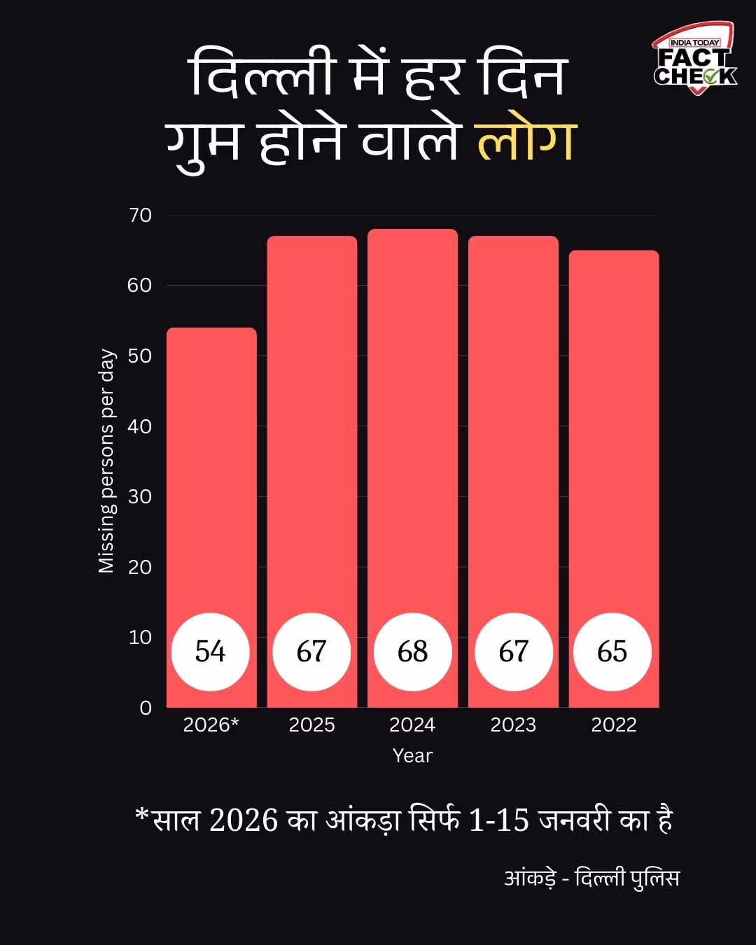 A daily report of 54 missing individuals is indeed worrying. However, two more points need consideration: Firstly, Delhi's population ranks among the largest in the world, close to 20 million. Secondly, the disappearance rate hasn't surged dramatically. Looking at the past five years, between 65 to 68 people went missing daily.