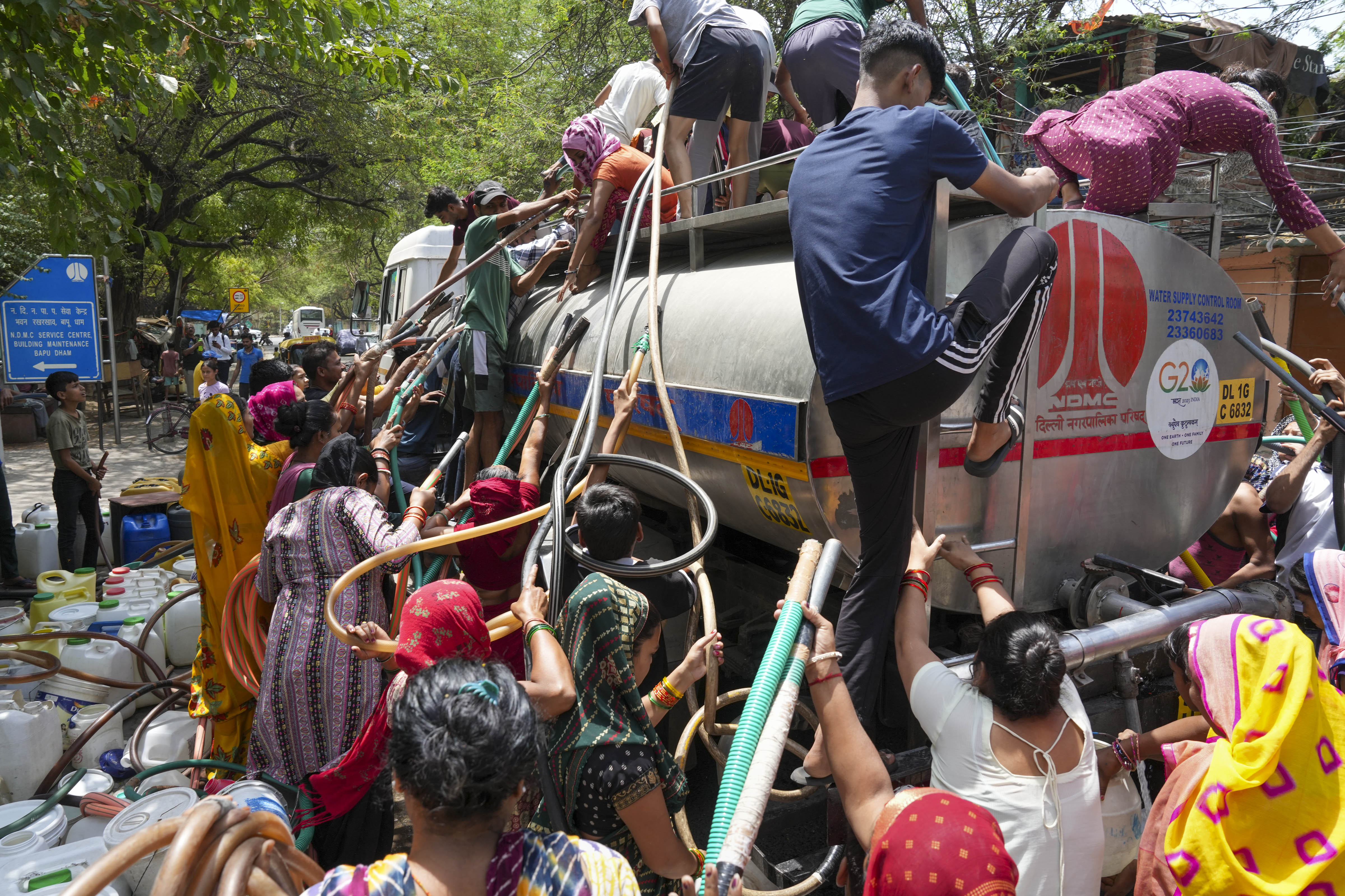 In Vasant Vihar's Kusumpur Pahari, people queue up in the scorching sun to draw water from a tanker. The crisis is particularly distressing for women, who bear the burden of water collection as most men and boys are out at work during the day. In some places, people start lining up overnight just for water.