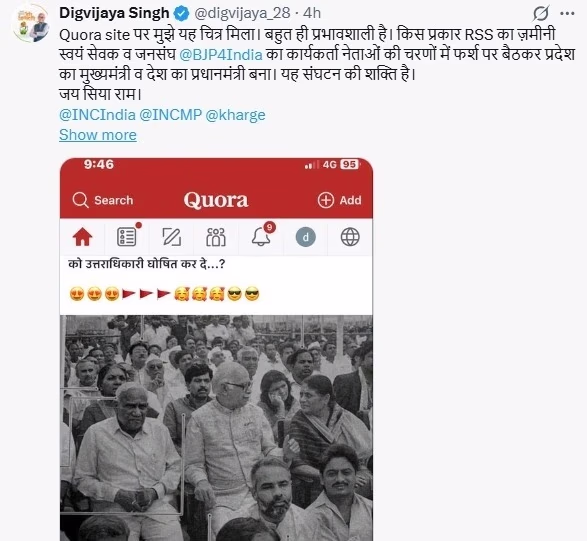 Digvijaya Singh recently praised the organizational might of RSS. Sharing an old photo of PM Modi on X, he remarked, 'I found this image on Quora. It's quite impactful. It shows how grassroots volunteers and workers of RSS and Jan Sangh BJP have climbed political ranks to chief minister and prime minister. This signifies the power of organization. Jai Siya Ram.' However, Singh was clear in his rejection of RSS’s ideology.
