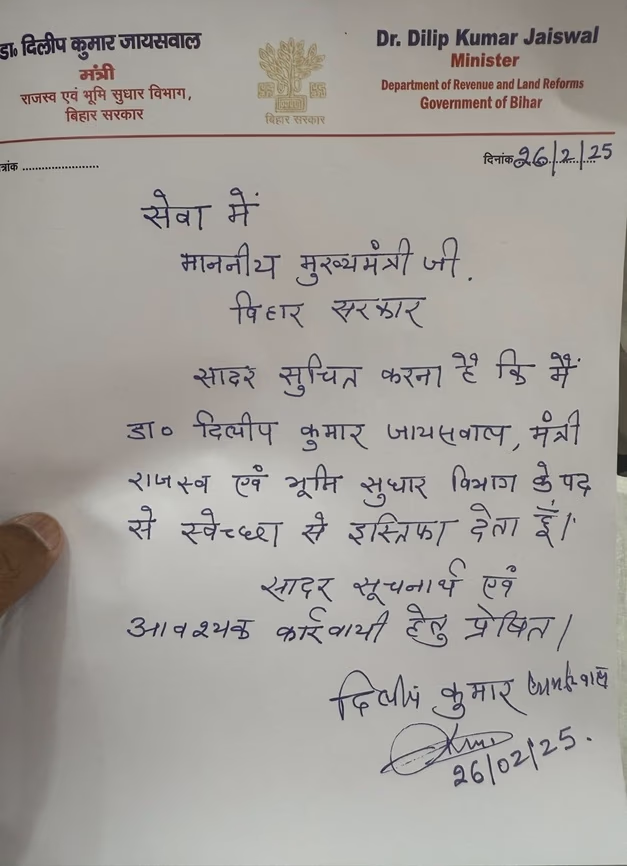 In his resignation sent to the Chief Minister, Dilip Jaiswal voluntarily stepped down from his ministerial role. He was in charge of the Revenue and Land Reforms Department. Nitish Kumar's cabinet expansion is expected to take place at 4 PM today, where seven ministers from the BJP quota will take the oath of office and secrecy.