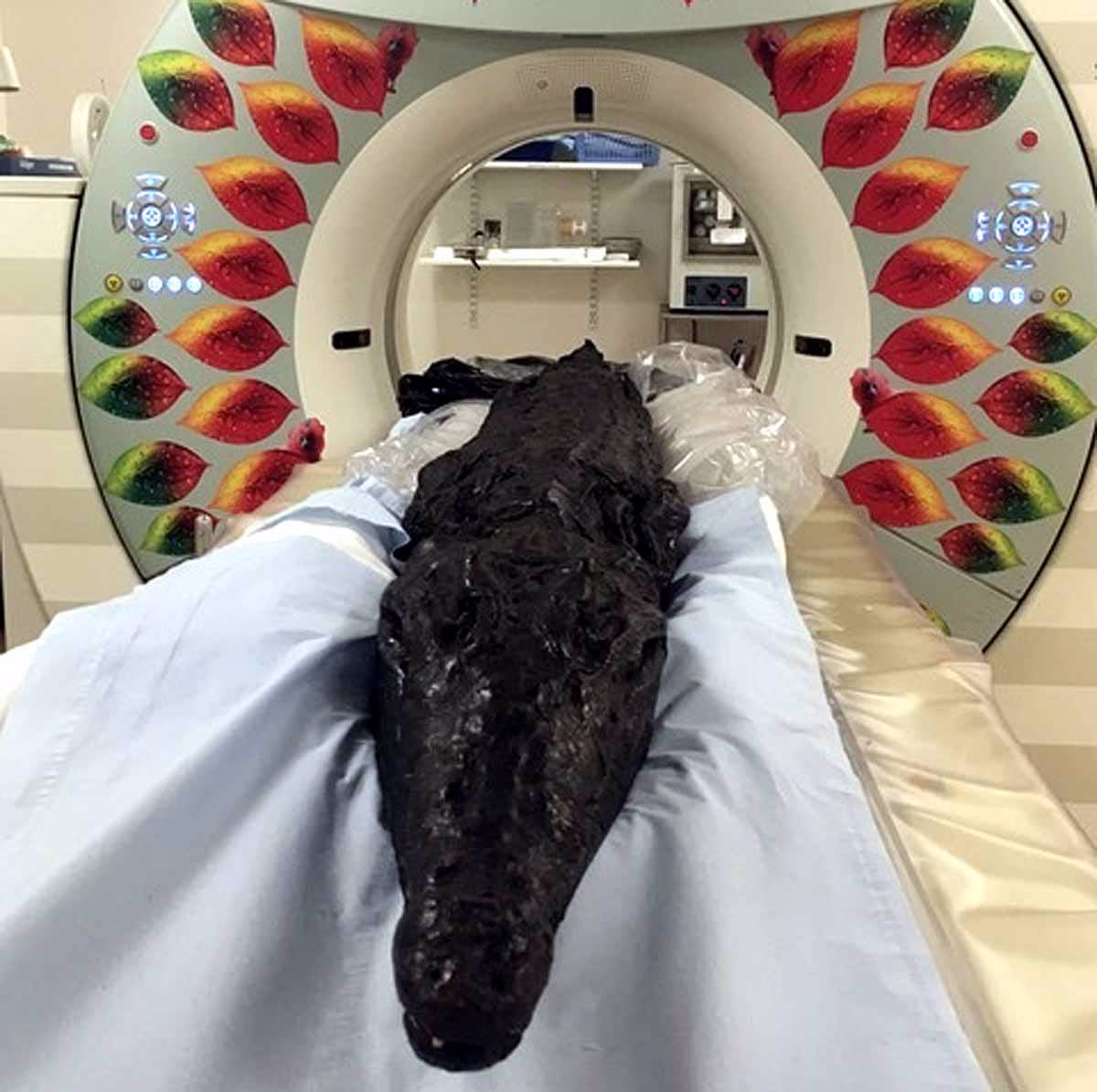 This crocodile is 2.23 meters long and is housed at the Birmingham Museum and Art Gallery. It underwent radiographic study at the Royal Manchester Children's Hospital, using medical tools to peer inside without damaging it. Gastroliths, or small stones swallowed to aid digestion, were found in its stomach, proving that the mummification process left internal organs intact. Also found were fish hooks and metal, likely used to catch it.