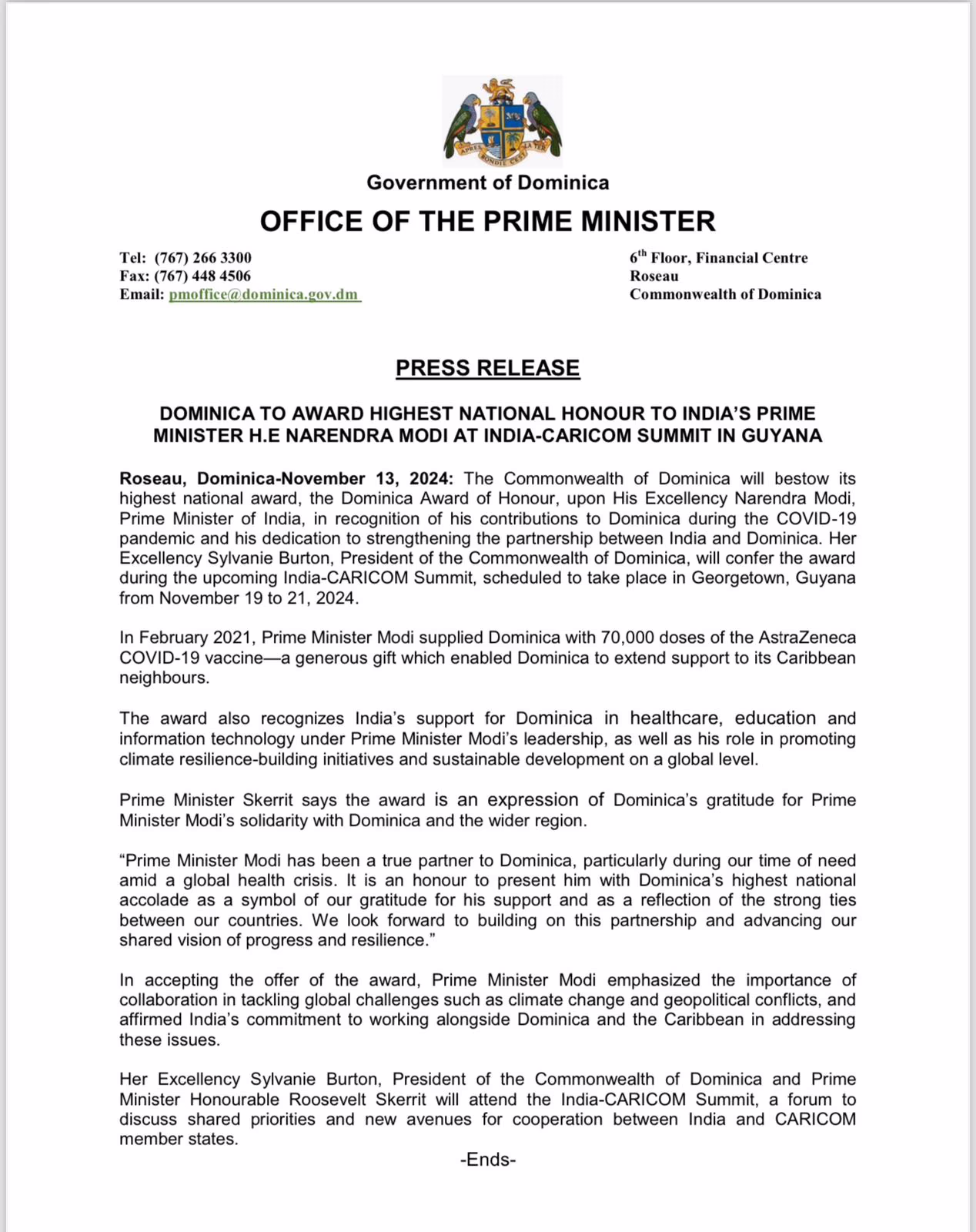 Prime Minister Modi will receive this prestigious award from Dominica's President Sylvanie Burton during the India-CARICOM summit scheduled from November 19 to 21 in Georgetown, Guyana. Notably, in February 2021, Prime Minister Modi dispatched 70,000 doses of the AstraZeneca COVID-19 vaccine to Dominica, helping save lives not only in Dominica but also among its Caribbean neighbors.