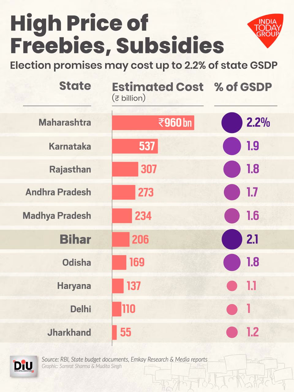 The burden on state governments is substantial. The estimated costs of free schemes and subsidies for 2023-24 are: