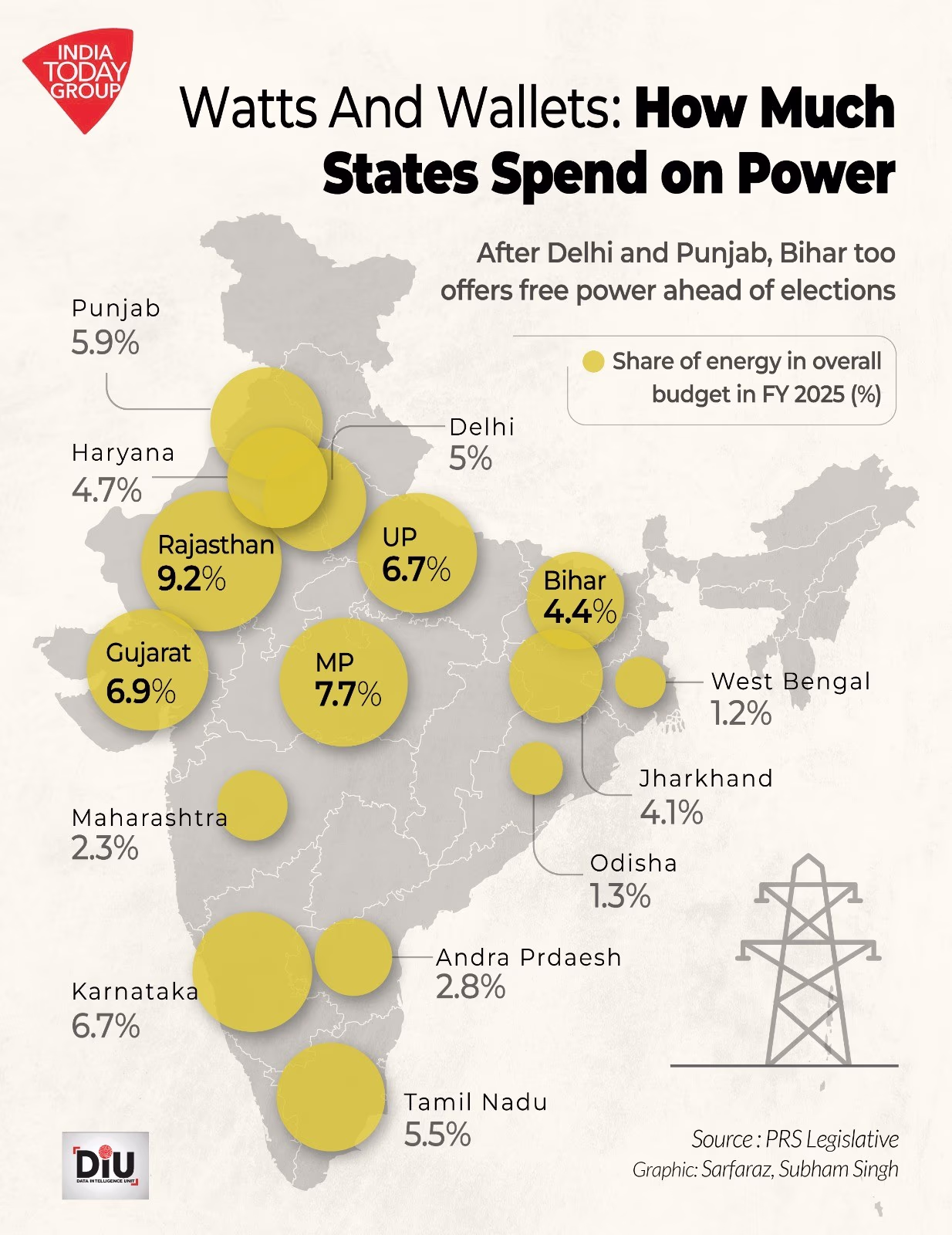 The pre-election announcement of free electricity raises economic concerns for Bihar. Chief Minister Nitish Kumar declared that households would receive 125 units of free electricity monthly ahead of state elections. Existing subsidies devour half of the state’s development budget. For 2024-25, the 'Mukhyamantri Vidyut Upbhokta Sahayata Yojana' allocates a budget of ₹15,343 crores.