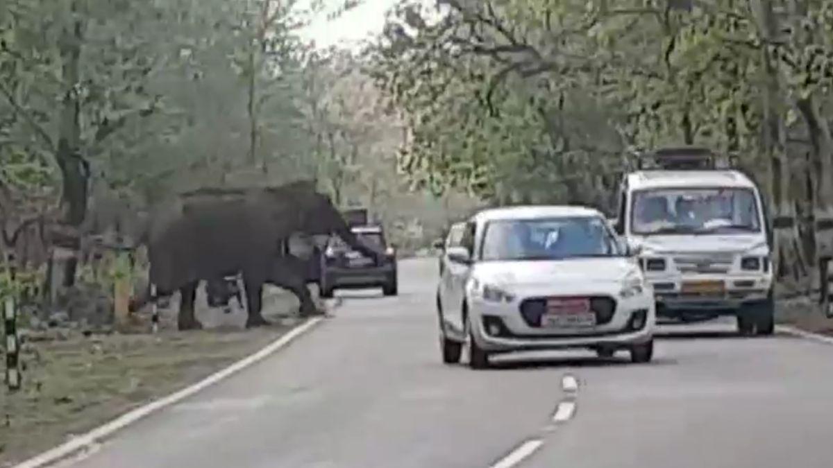 On the busy highway between Rishikesh and Dehradun in Uttarakhand, something truly awe-inspiring occurred: a group of majestic elephants emerged from the forest onto the road. The presence of vehicles halted their crossing, agitating the gentle giants. What ensued was a dramatic stand-off as the elephants attempted to charge at the vehicles, igniting a sense of alarm among drivers who began to retreat to safety.
