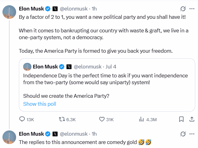On July 4th, during American Independence Day celebrations, Musk posted a poll on his platform X, asking followers, 'Isn’t now the perfect time to discuss freedom from the two-party (or some call it one-party) system! Should we form the America Party?'