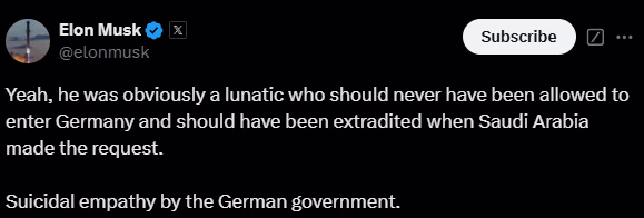 In another post, Elon Musk unequivocally stated that the eccentric should not have been allowed entry into Germany and should have been extradited at Saudi Arabia's request. He deemed it an act of suicidal sympathy by the German government. Musk previously demanded the resignation of German Chancellor Olaf Scholz due to this horrific attack, calling him foolish.