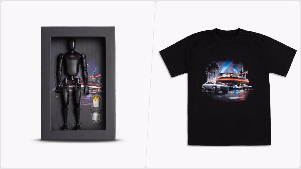 The Tesla Diner also offers themed merchandise, including vintage-style Hollywood diner T-shirts, Tesla Bot action figures, supercharged gummy candies, and Tesla restaurant-branded trucker caps. (Photo: X/@Tesla)