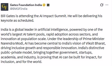 Initial reports on Tuesday suggested that Gates might skip the AI summit in India, but later the Gates Foundation of India stated that he will indeed participate and deliver his address. The statement highlighted that India is a "global leader in Artificial Intelligence," boasting one of the largest AI talent pools, quickly being adopted across sectors.