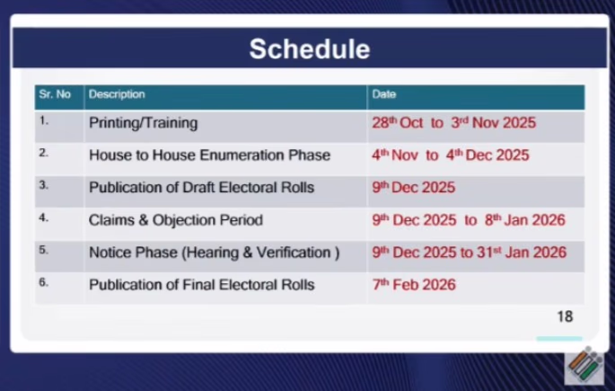 From October 28 to November 3, 2025, printing and training will occur, followed by house-to-house enumeration from November 4 to December 4, 2025. A draft electoral roll will be released on December 9, 2025. The process for filing claims and objections will run from December 9 to January 8, 2026, while hearings and verifications will continue from December 9 to January 31, 2026.