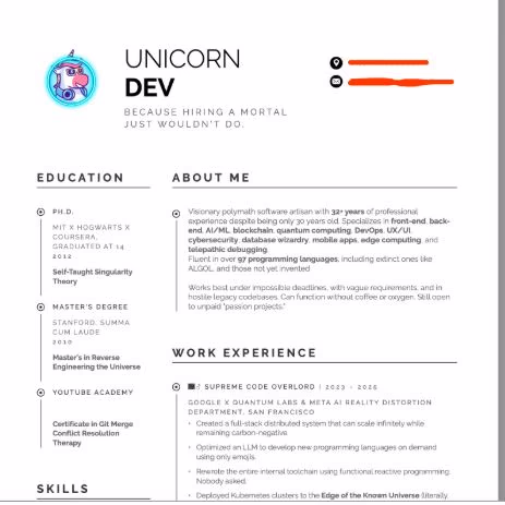 A young man was repeatedly rejected. Some said, "You're not fit for this role," while others didn't reply at all. As hope began to fade, he did something unexpected out of frustration. He crafted a humorous parody resume—purposely filled with absurd and funny details. For example: "32 years of experience at age 30," expert in "Telepathic Debugging," PhD from "MIT, Hogwarts, and Coursera," ability to work without coffee or oxygen, and employment at "Google X Quantum Labs" and "Meta AI Department." He even wrote how a company had to replace him with 30 engineers because they couldn't afford him!