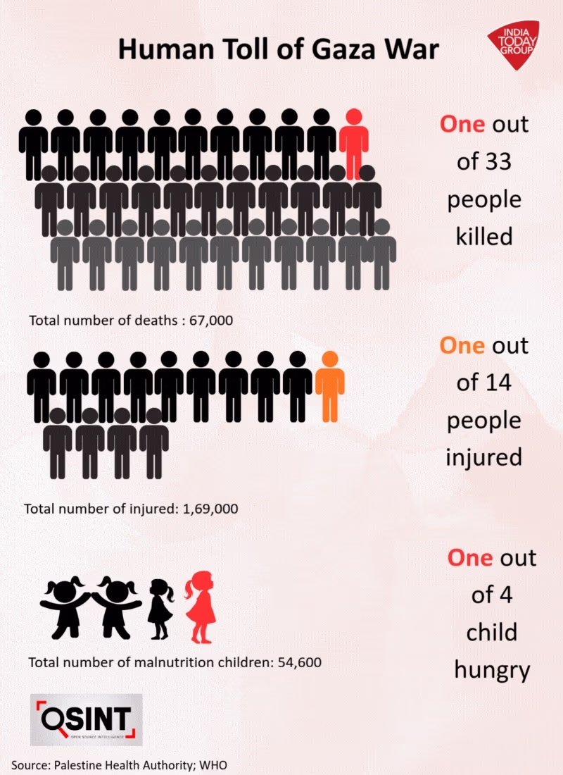 Israeli attacks on Gaza resulted in the death of at least 67,000 people and injured 169,000 - representing about 3% of the pre-war population. Overall, the toll amounts to nearly 10% of Gaza's 2.3 million residents.