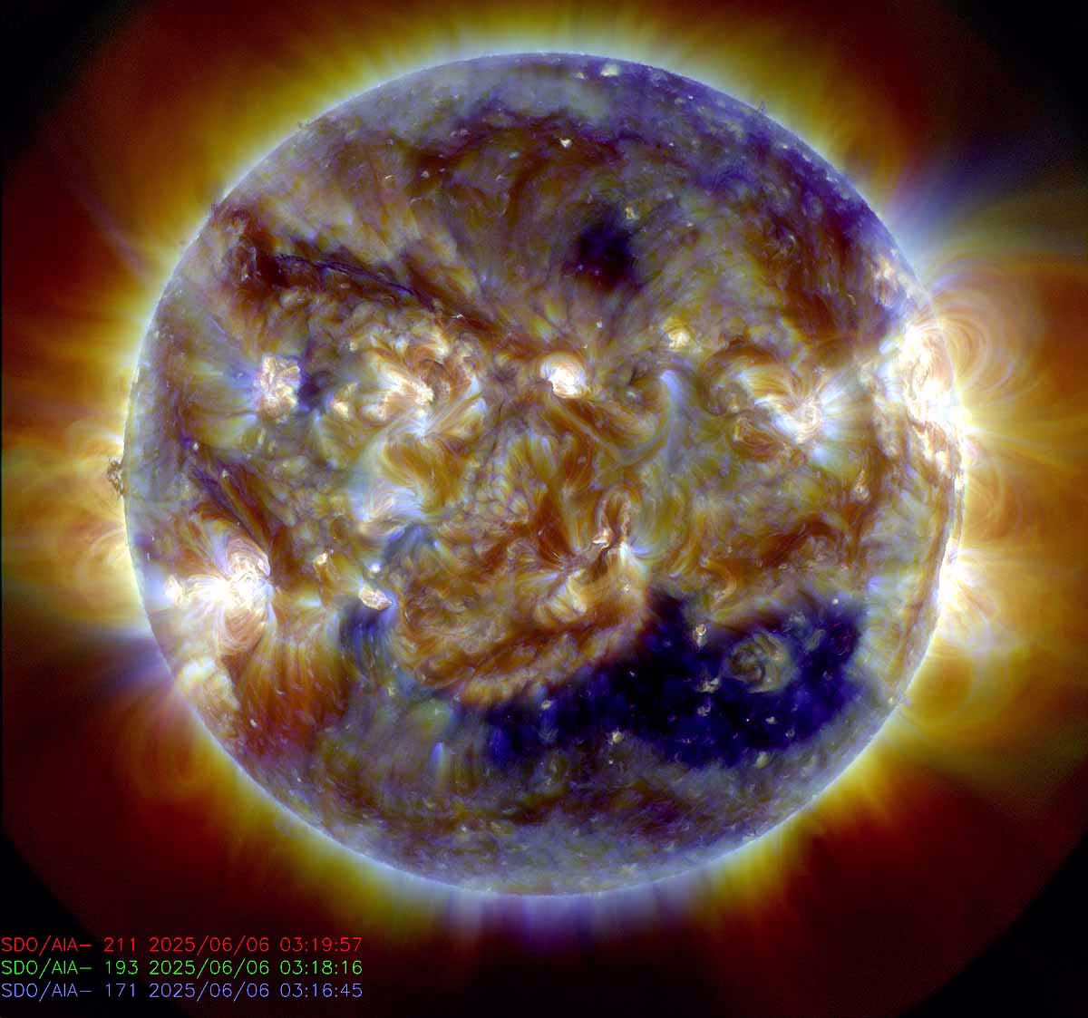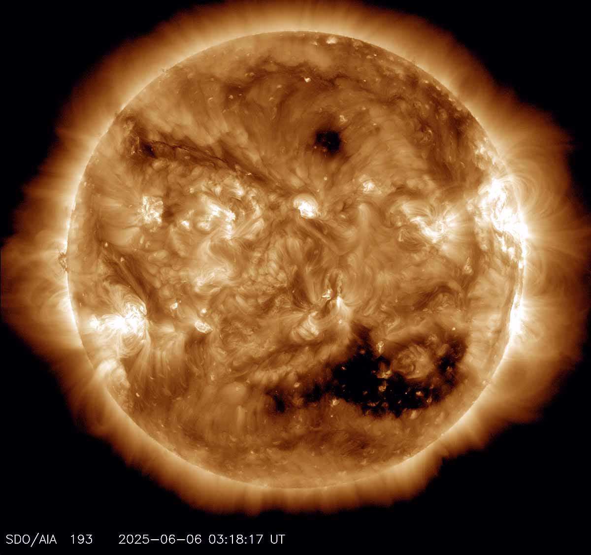 On June 6, 2025, an extraordinary spectacle appeared on the Sun's surface. A giant orifice akin to a gaping ‘mouth’ stretched across, while two eye-like sunspots adorned the scene, portraying an expression of surprise. This is known as a coronal hole, allowing solar wind to escape into space.