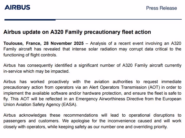 In a press release, Airbus acknowledged a recent incident involving intense solar radiation corrupting vital flight control system data of an A320 family aircraft. Recognizing the potential impact on a large number of in-service aircraft, Airbus, in cooperation with aviation authorities, issued an Alert Operators Transmission (AOT). Based on this, EASA has enacted an Emergency Airworthiness Directive. Understandably, these recommendations will cause operational disruptions. We apologize for any inconvenience and assure you of our commitment to safety, collaborating closely with airlines.