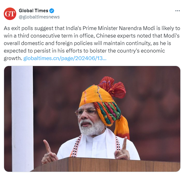According to Global Times, 'Surveys indicate that PM Modi is likely to win a third term. Chinese experts predict that Modi will maintain comprehensive domestic and foreign policies. His focus on boosting India's economic growth will continue.'