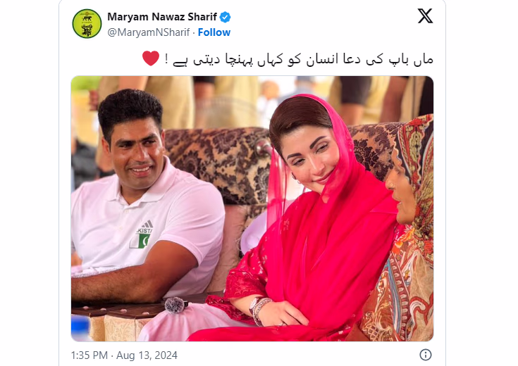 Maryam shared photos of the meeting on X, posting, 'Prayers of parents take a person to new heights!' In another post, she said, 'Well done, Arshad Nadeem,' sharing pictures of herself placing the medal around Arshad's neck.
