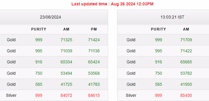 According to the India Bullion And Jewellers Association, on Friday evening, August 23, the price of 24-carat gold was 71,424 rupees per 10 grams, which has now risen to 71,709 rupees as of the morning of August 26, 2024. Similarly, both gold and silver have become more expensive based on purity.
