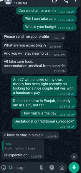 After this conversation, I became a surrogate myself, looking for intended parents on social media. I contacted a man claiming to be from Punjab through WhatsApp and phone calls.