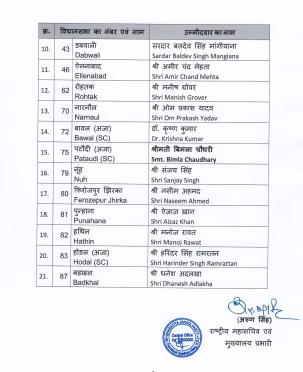The Bharatiya Janata Party (BJP) has released its second list for the Haryana Assembly Elections. The list includes names of 21 candidates. The BJP has excluded the tickets of two ministers: current legislator and Education Minister Seema Trikha from Badkhal, and Public Health Minister Dr. Banwari Lal from Bawal. In place of Seema Trikha, the BJP has fielded Dhanesh Adlakha in Badkhal, while Dr. Krishna Kumar will contest in Bawal instead of Banwari Lal. Earlier, the BJP had announced 67 candidates in its first list.