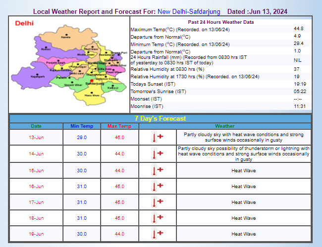 Delhi's residents are suffering not only from the scorching heat but also from shortages in water and power supply. IMD has declared a heatwave alert for the city till June 19, anticipating the continuance of intense hot winds. Throughout this week, Delhi's maximum temperatures might hover around 44 to 45 degrees Celsius, with minimum temperatures likely to remain between 30 and 31 degrees Celsius.