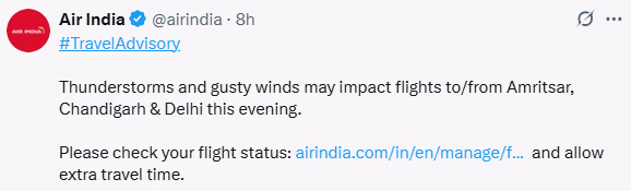 SpiceJet cautioned that departures and arrivals might be affected due to the bad weather, advising passengers to stay updated on their flight status. Meanwhile, Air India reported the potential for similar disturbances affecting flights in Delhi, Amritsar, and Chandigarh due to thunderstorms and strong winds on Sunday evening and night.