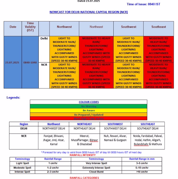 The NCR regions, including Loni Dehat, Hindon AF Station, Ghaziabad, Indirapuram, Chapraula, Noida, Dadri, Greater Noida, Faridabad, Ballabhgarh, alongside Aurangabad, Hodal (Haryana), Shamli, Muzaffarnagar, Kandhla, Khatauli, Sakauti Tanda, Daurala, Meerut, Modinagar, Pilkhuwa, Nandgaon, and Barsana, are also set to experience storms, rains, and strong winds.