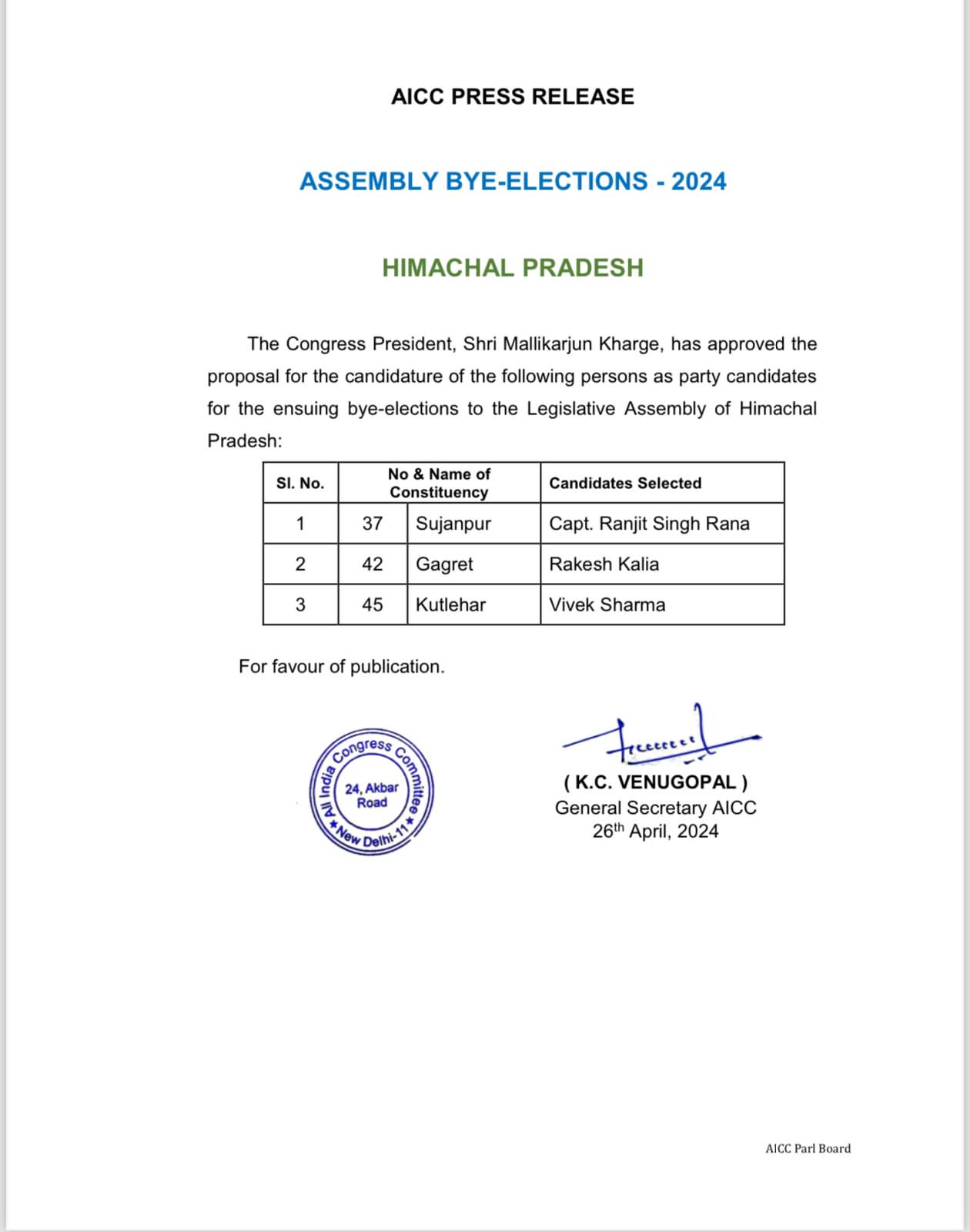 The Congress Party has officially declared its candidates for three assembly constituencies in the upcoming by-elections in Himachal Pradesh. Ranjit Singh Rana is contesting from Sujanpur, Rakesh Kalia from Gagret, and Vivek Sharma from Kutlehar. This follows disciplinary action against six MLAs who rebelled by voting for the BJP in the Rajya Sabha elections.