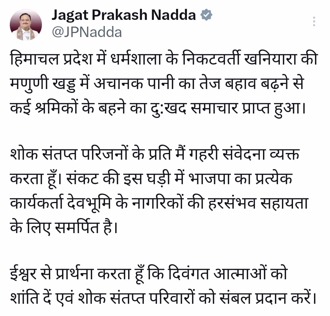 He wrote in Hindi on social media platform X, 'Tragic news of several workers being swept away due to sudden increase in water flow near Khaniyara's Manuni stream, close to Dharamshala in Himachal Pradesh. I express deep condolences to the bereaved families. In this moment of crisis, every BJP worker is dedicated to assisting the citizens of this land in every possible way.'