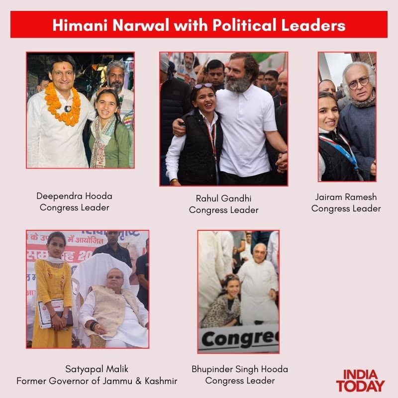 Himani was also spotted at various events in the company of Congress leaders such as Bhupinder Singh Hooda, Deepender Hooda, Jairam Ramesh, and local leaders Geetanjali Bhukal and Induraj Narwal. She stood alongside former Jammu and Kashmir Governor Satyapal Malik. Former India Youth Congress leader Srinivas BV mentioned her dedicated work as the district vice-president of the youth congress in Rohtak (rural), highlighting her remarkable commitment to organizational events, including the Bharat Jodo Yatra.