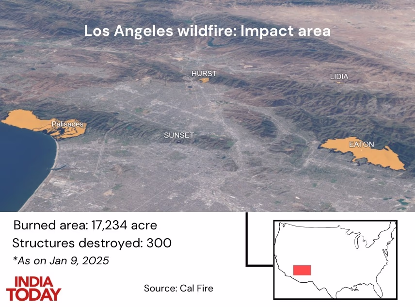 Out of the six separate wildfires in Los Angeles, three were completely out of control. These include two massive blazes on the eastern and western edges of the city, and the smaller Sunset Fire, sitting above the famed Hollywood Boulevard and its Walk of Fame.